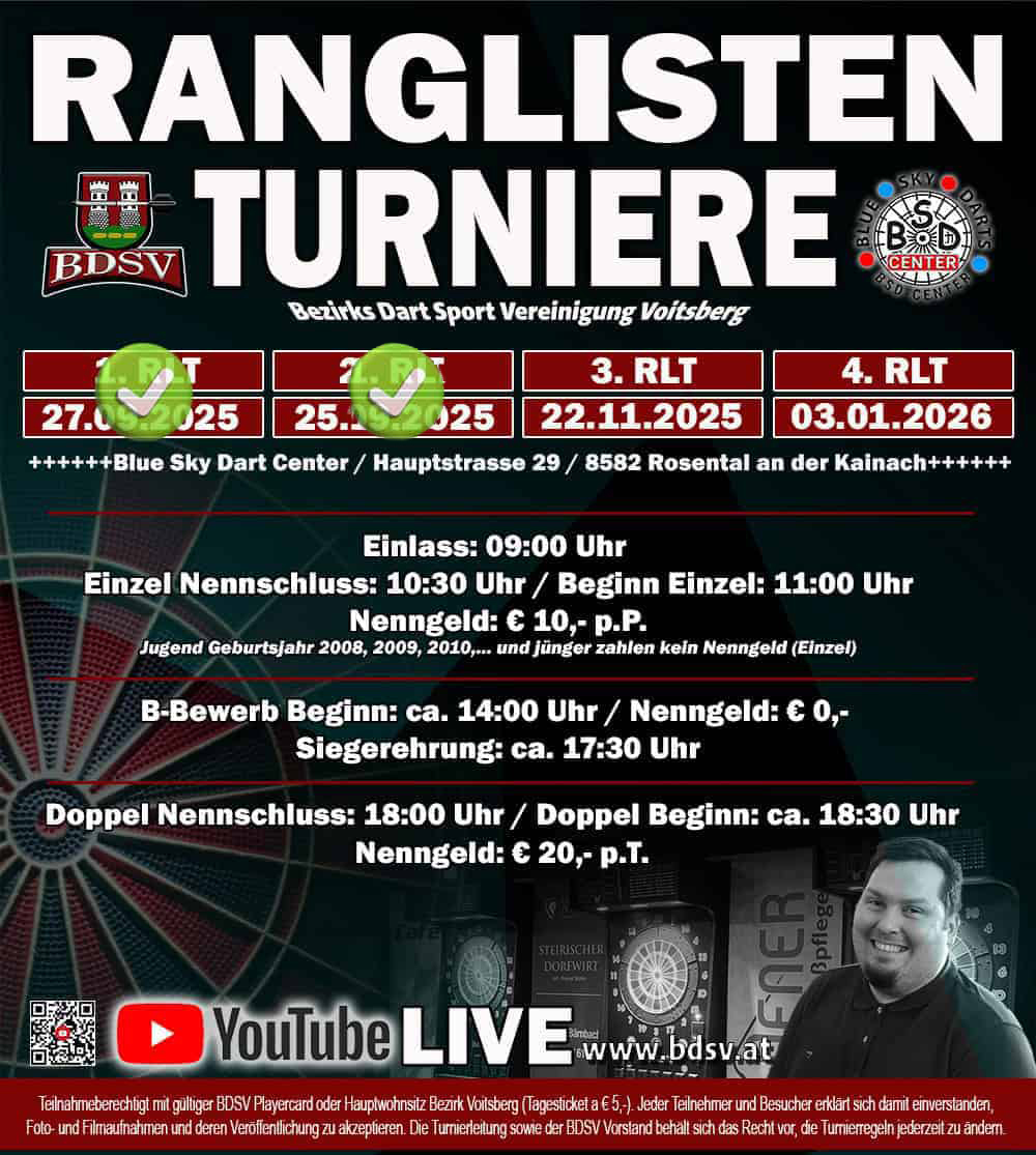 Wir laden alle BDSV Spieler und welche die es noch werden wollen recht herzlich zu den Ranglisten Turnieren der Saison 2025/26 ein.