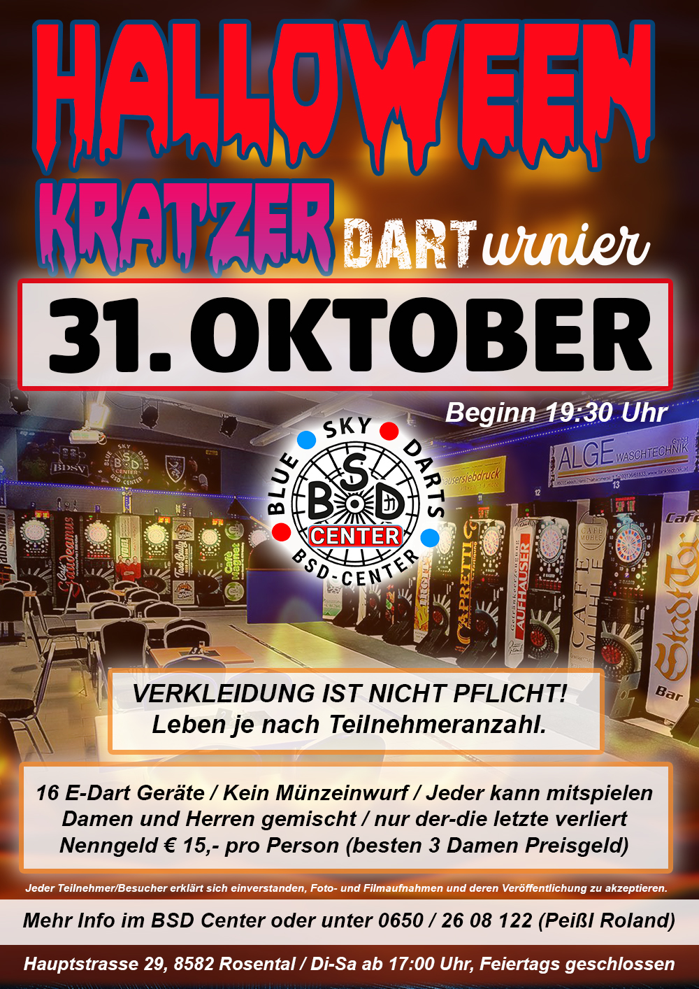 Das BSD-Center lädt zum Halloween Dart Turnier am 31.10.2025.