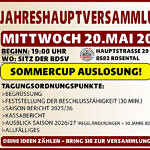 Am Mittwoch, den 20. Mai 2026, lädt der BDSV zur diesjährigen Jahreshauptversammlung nach Rosental ein. Beginn ist um 19:00 Uhr am Sitz des BDSV (Hauptstraße 29 in Rosental).