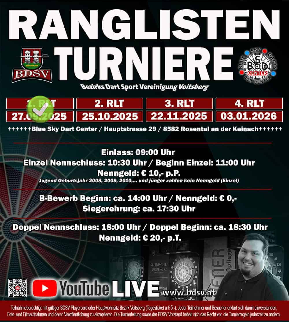 Wir laden alle BDSV Spieler und welche die es noch werden wollen recht herzlich zu den Ranglisten Turnieren der Saison 2025/26 ein.