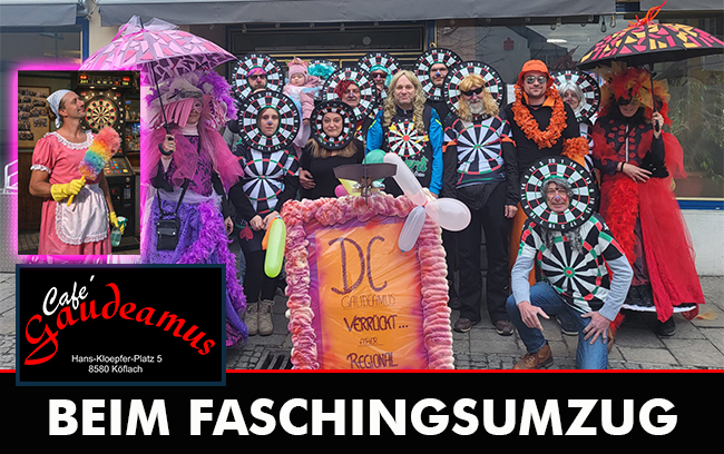 Der Köflacher Faschingsumzug – organisiert von der Stadtgemeinde Köflach und den legendären Blochziehen Pichling – verwandelte die Innenstadt in eine Mischung aus Straßenfest, Freiluft-Disco und sportlicher Tarnübung. Denn was da vom Cafe Gaudeamus samt Mitglieder- und Stammgäste-Gefolge durch die Gassen rollte, hatte man so noch nicht gesehen.
